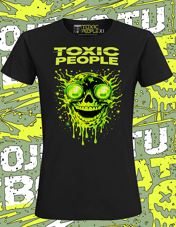 Na přední straně najdeš výraznou neonově zelenou lebku s roztékajícím se efektem, doplněnou o nápis Toxic People. Oči ve stylu disco koulí dodávají designu unikátní party vibe.