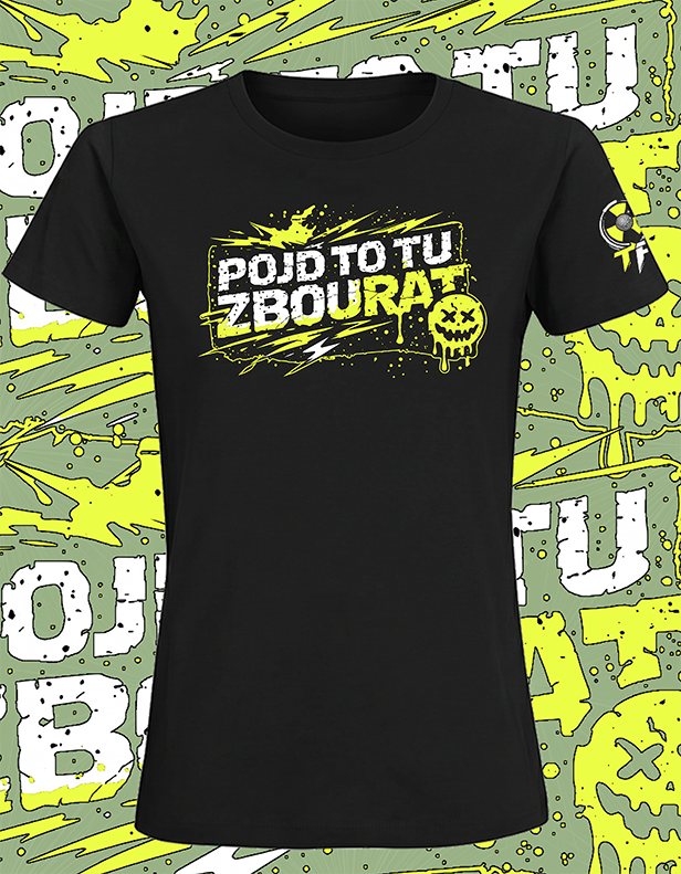 Na přední straně najdeš velký nápis POJĎ TO TU ZBOURAT ve stylu graffiti, doplněný o toxické prvky a detaily. Design je čitelný, úderný a funguje okamžitě.