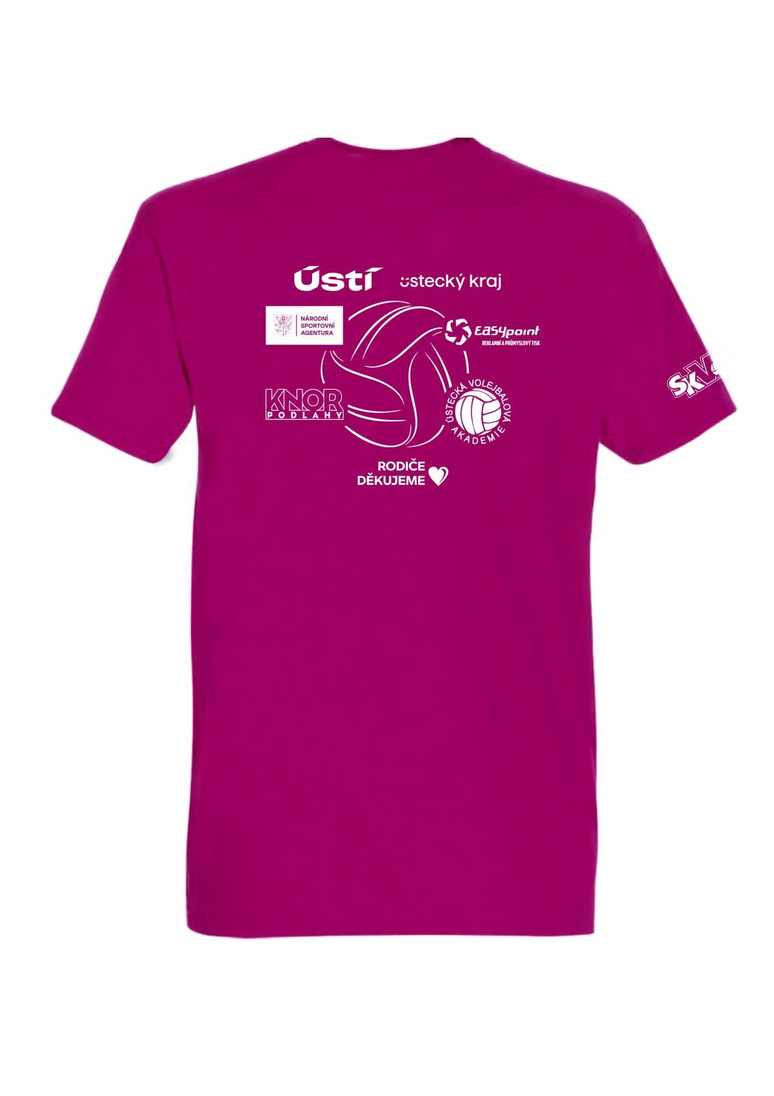 - tričko s potiskem na levém prsu erb SK volejbal Ústí nad Labem, vzadu na zádech je potisk sponzorů, pravý rukáv má potisk logo SKVD